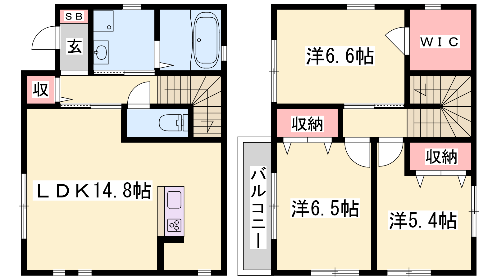 - LDK14.8帖、洋室6.6帖、洋室6.5帖、洋室5.4帖