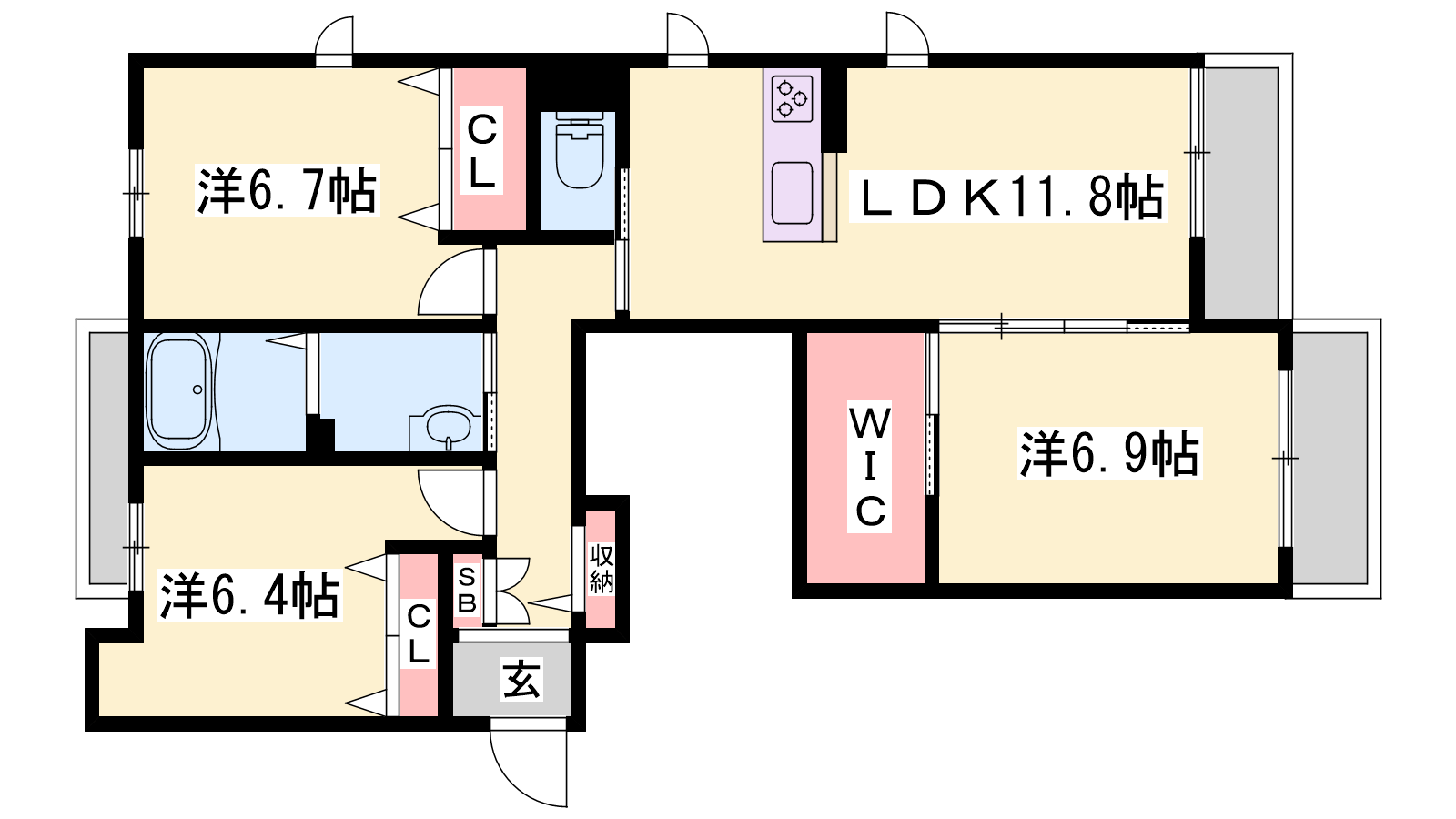- LDK11.8帖、洋室6.9帖、洋室6.7帖、洋室6.4帖