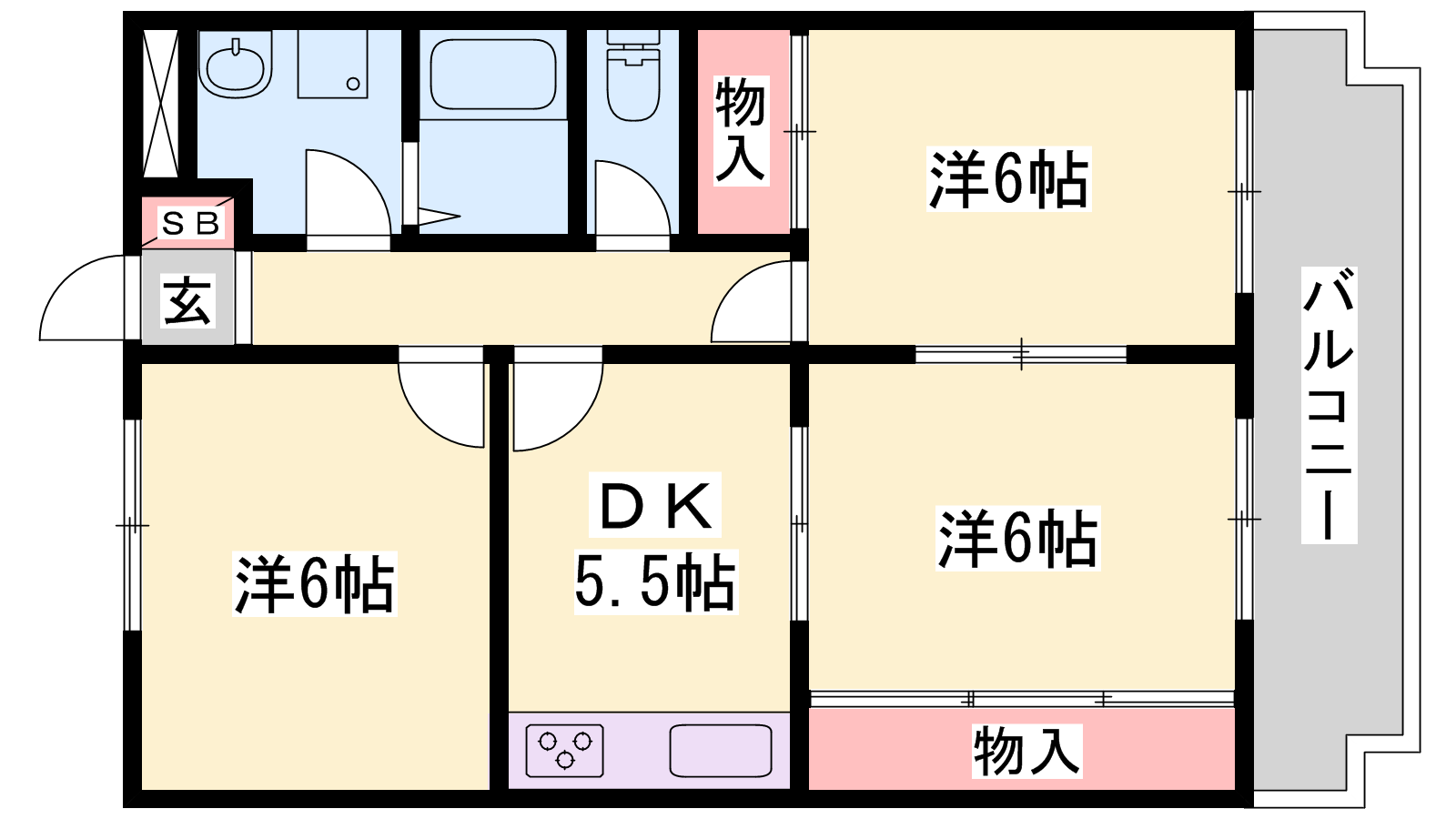 - DK5.5帖、洋室6帖、洋室6帖、洋室6帖